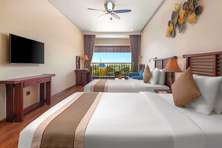 Double Deluxe Pool and River view with Balcony is 420 square feet and includes a king-size bed 150-183 width plus balcony, cable tv, hairdryer, ironing set, safe, bathrobes, and slippers.