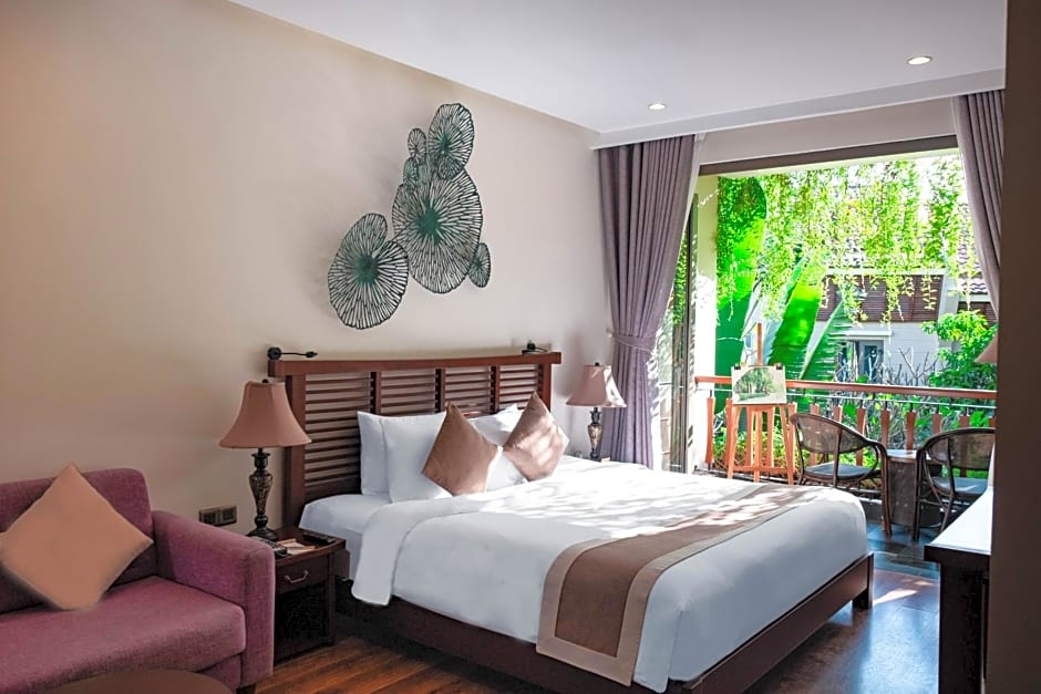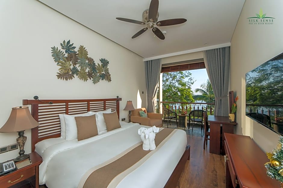 Deluxe Pool and River view with Balcony is 420 square feet and includes a king-size bed 150-183 width plus balcony, cable tv, hairdryer, ironing set, safe, bathrobes, and slippers.